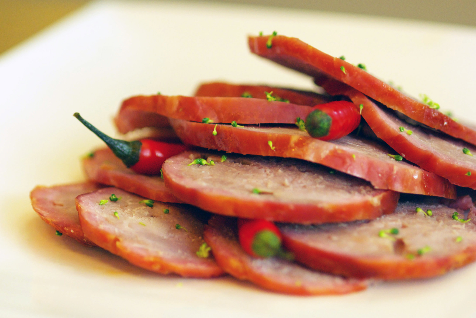 郭榮市「黑豚哈姆」不添加任何香料、色素、防腐劑,僅以日本進口之珍稀「櫻花木屑」煙燻入味,每條「黑豚哈姆」在炭火烘焙三個小時後,還需經過40分鐘的低溫煙燻,讓櫻花木的天然芳香深入火腿肉質纖維,成就「黑豚哈姆」獨特的頂級口感。