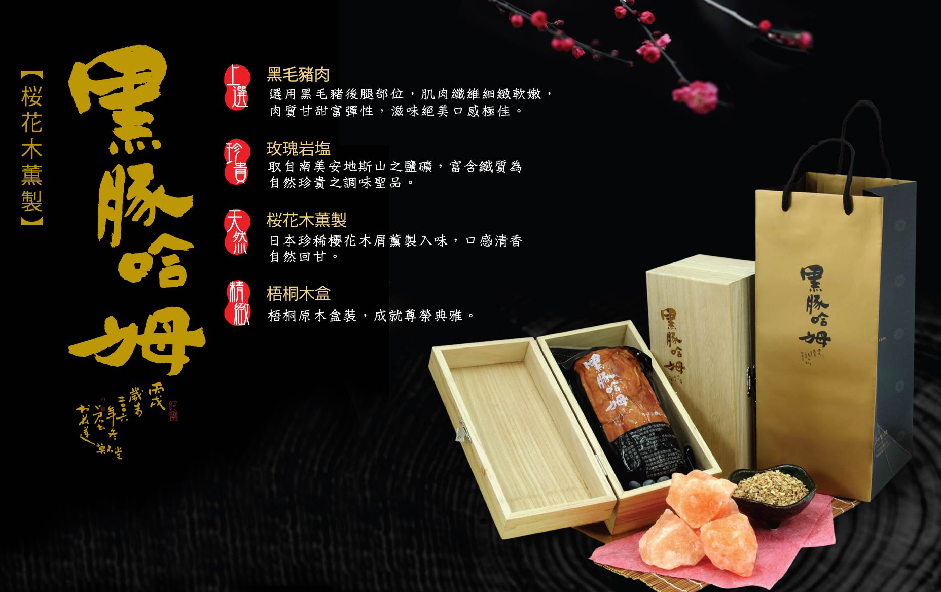 郭榮市「黑豚哈姆」精緻高雅的梧桐木盒包裝,渾元的字體彰顯出黑豚哈姆多層次的獨特口感,品嚐頂級黑豬肉手工火腿,讓送禮也充滿了典雅氣質。