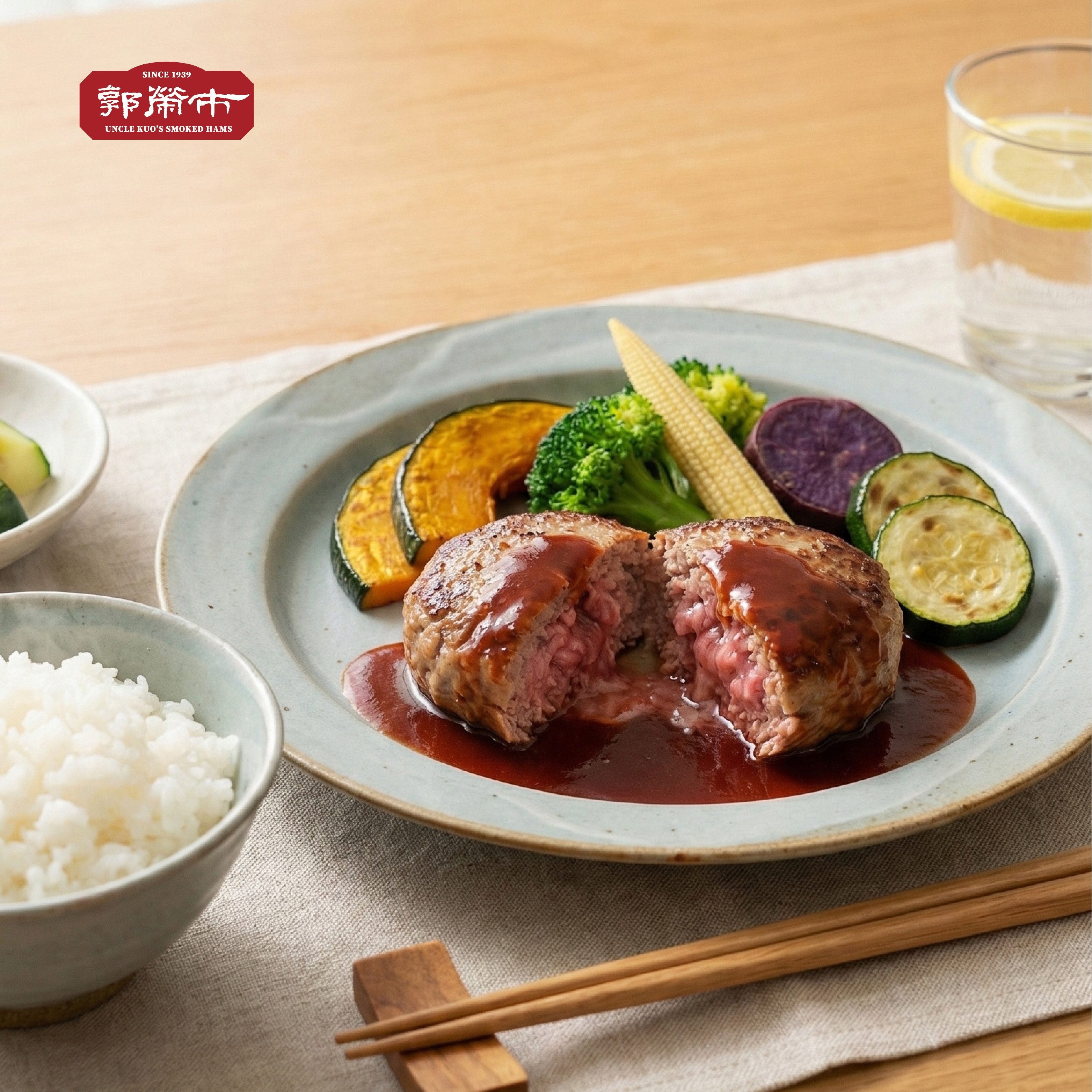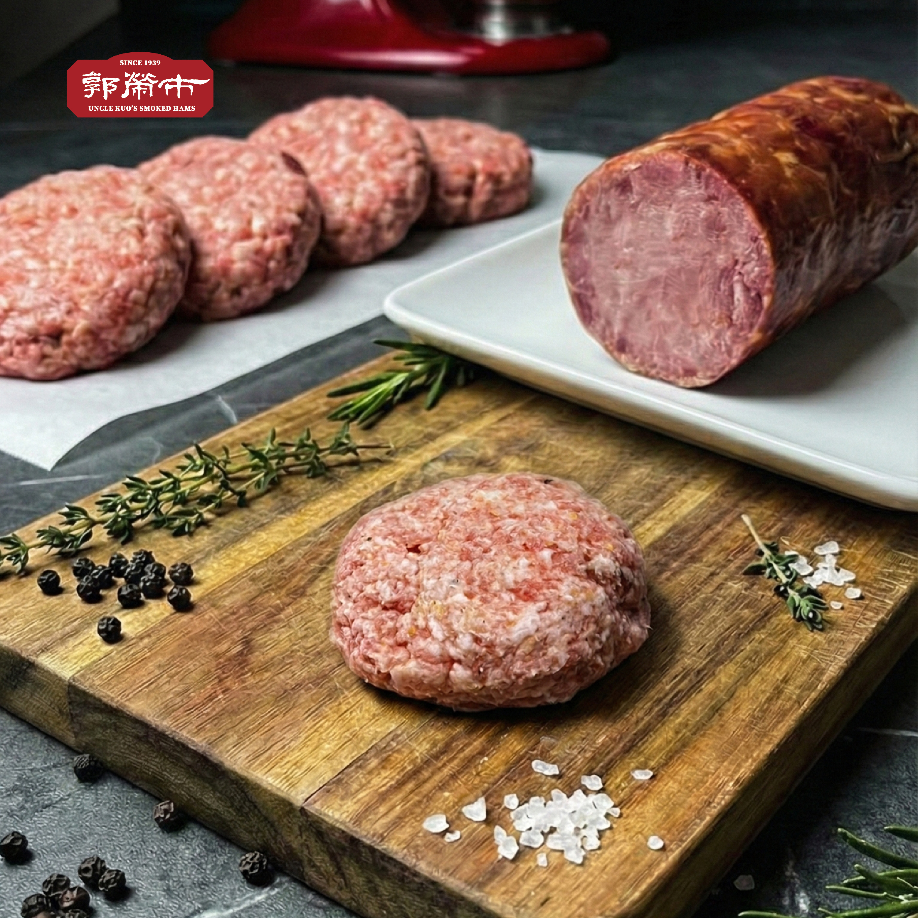 這不是你印象中的普通漢堡排。 我們將傳承 86年的郭榮市煙燻火腿,切成細丁,豪邁地揉進花蓮在地溫體豬後腿肉中。 每一顆,都是手工千錘百鍊的「手拍」工藝; 每一口,都吃得到鮮肉的甜與火腿的燻香。 今晚,讓家裡的餐桌,變身高級洋食館。