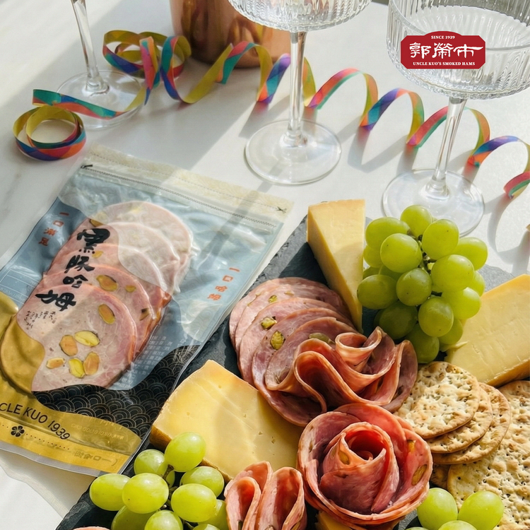 郭榮市開心果黑豚切片包,使用花蓮黑毛豬後腿肉,以櫻花木煙燻熟成。
